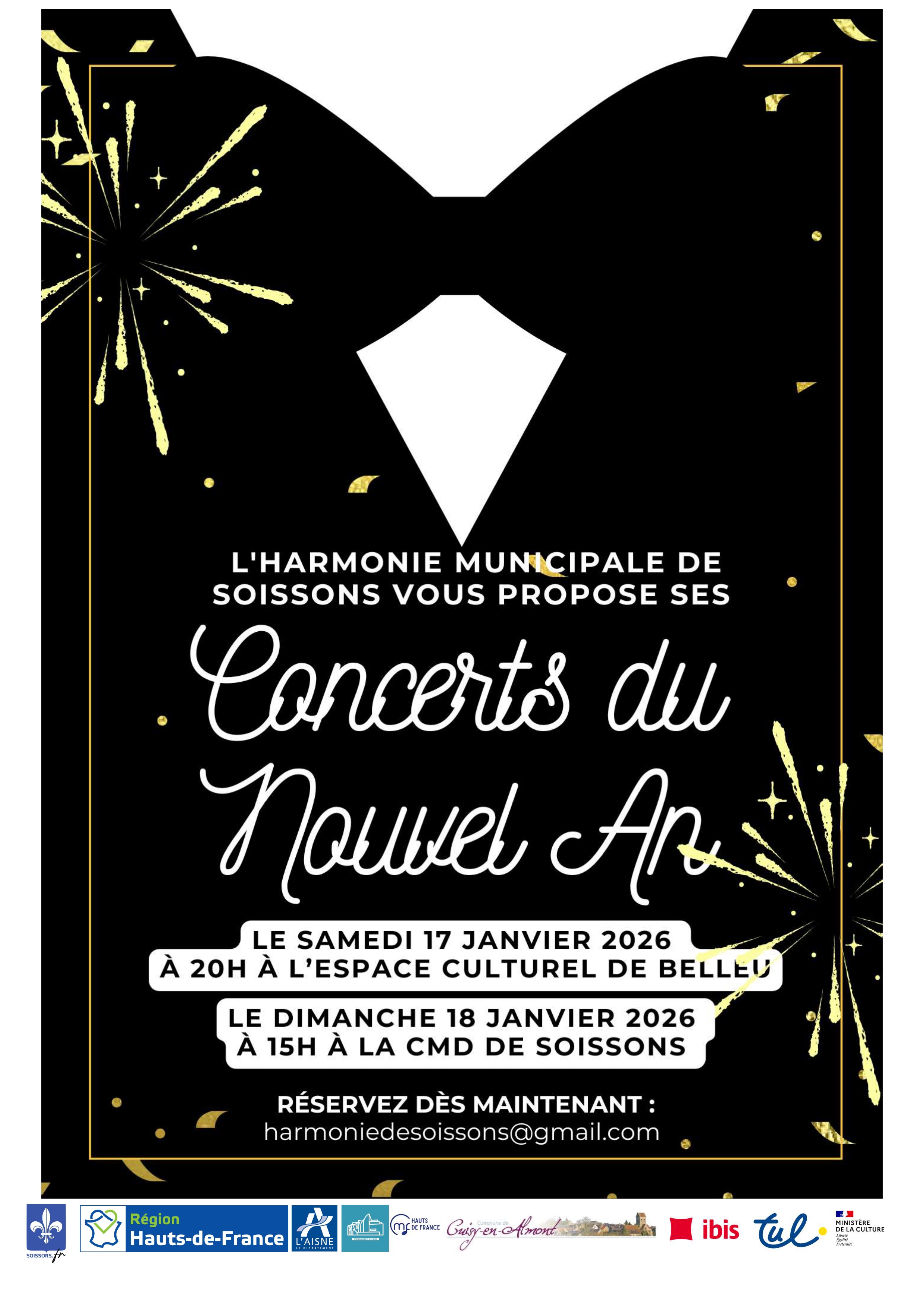 L'Harmonie Municipale de Soissons, sous la direction de Pierre LEMAIRE et de Julien DERLON, vous propose d'assister à son concert du Nouvel An. Un programme festif pour toute la famille afin de commencer l’année en musique. Entrée gratuite réservation possible sur harmoniedesoissons@gmail.com
