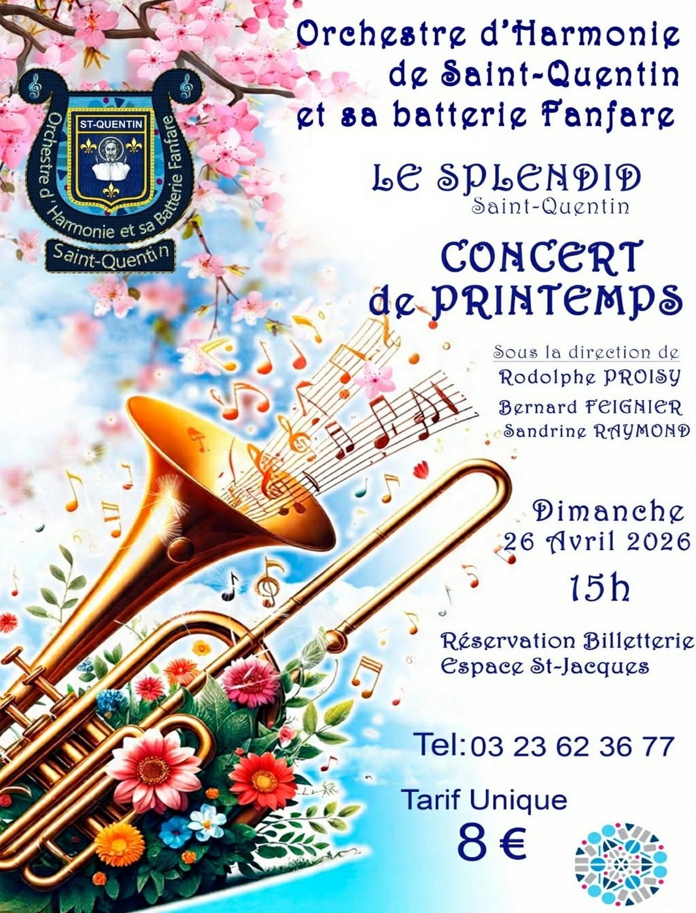 L’orchestre d’harmonie de Saint-Quentin et sa batterie fanfare vous donne rendez-vous au Splendid le dimanche 26 avril 2026 à 15 heures pour son concert de Printemps. Tarif unique de 8€. Billetterie à l’espace Saint-Jacques. Orchestre d'Harmonie de Saint-Quentin