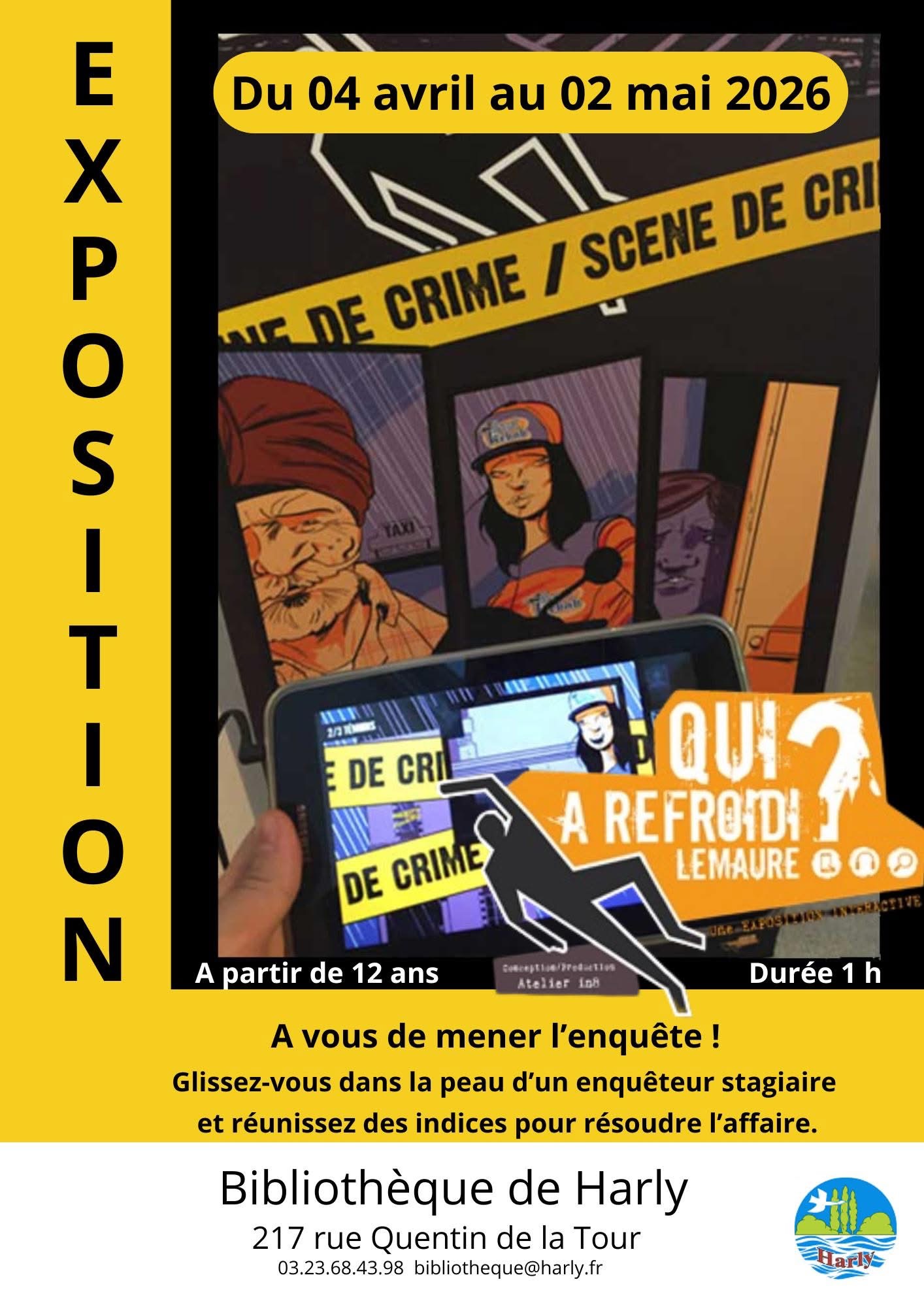 La bibliothèque de Harly vous propose l'exposition interactive " Qui a refroidi Lemaure?" du 4 avril au 2 mai ! Ce matin-là, au 26 rue Dampierre, un jeune homme est retrouvé mort ! Que s’est-il passé ? Qui est le meurtrier ? Muni d’une tablette, venez arpenter les lieux de l’intrigue, collecter les indices, interroger les témoins. Seul ou en famille, réussirez vous à résoudre cette enquête ?