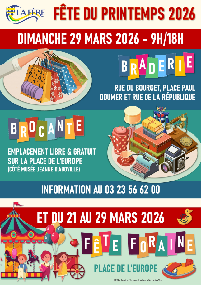 Au programme de la fête du printemps à La Fère cette année: Fête foraine du 21 au 29 mars sur la Place de l'Europe. Braderie et brocante le dimanche 29 mars de 9h à 18h dans le centre-ville de La Fère. La braderie s'installera rue du bourget, place Paul Doumer et rue de la République. En ce qui concerne la brocante, les emplacements seront gratuits sans inscription sur la Place de l'europe. Placement dès 7h30. Venez nombreux ! Informations au 03 23 56 62 00