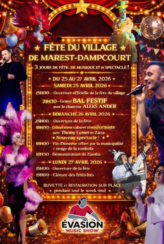 Rendez-vous le 25 au 27 Avril 2026 pour la fête du village de Marest-Dampcourt pour 3 jours de fêtes, de musique et de spectacles. Samedi 25 Avril 15h : Ouverture officielle de la fêtes du village. 21h30 : Grand Bal Festif avec le chanteur Aleks Ander. Dimanche 26 Avril 15h : Ouverture de la fête 16h : Grand show cabaret transformiste avec Thony Lymer et Zaza Nouveau spectacle ! 18h : Vin d'honneur offert par la municipalité + tirage de la tombola 18h30 : Démonstrations de Zumba Lundi 27 Avril 15h : Ouverture de la fête 19h : Clôture des festivités Buvette et restaurations sur place pendant tous le week-end.