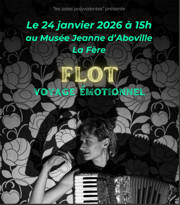 Rendez-vous le 24 janvier 2026 à 15h au porte du musée Jeanne d'Aboville de La Fère . Au programme un voyage émotionnel, une histoire musicale contée et chantée au travers de ses instruments et de sa voix, Flot nous plonge dans l'histoire et la reconstruction puissante d'un trauma . Tarifs : Entrée Prix Libre . Sur réservation uniquement auprès du musée . Non accessible aux personne à mobilité réduite. Information au 03 23 56 71 91 ou par Mail musee-daboville@ville-lafere.fr