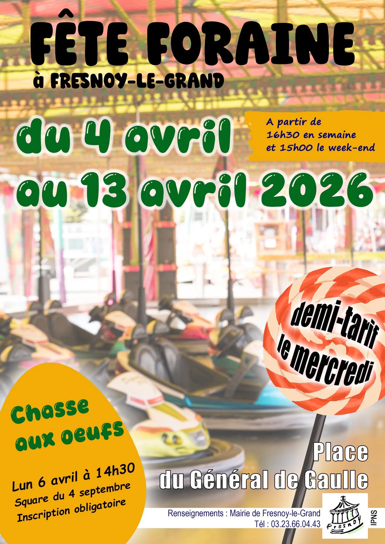 Venez profiter de la fête foraine de Fresnoy-le-Grand du 4 au 13 avril ! Elle s'installera sur la place du Général de Gaulle. Horaire : - 16h30 en semaine - à partir de 15h le week-end Demi-tarif le mercredi ! Une chasse aux œufs aura lieu le lundi 6 avril à 14h30 au square du 4 septembre. Inscription obligatoire.