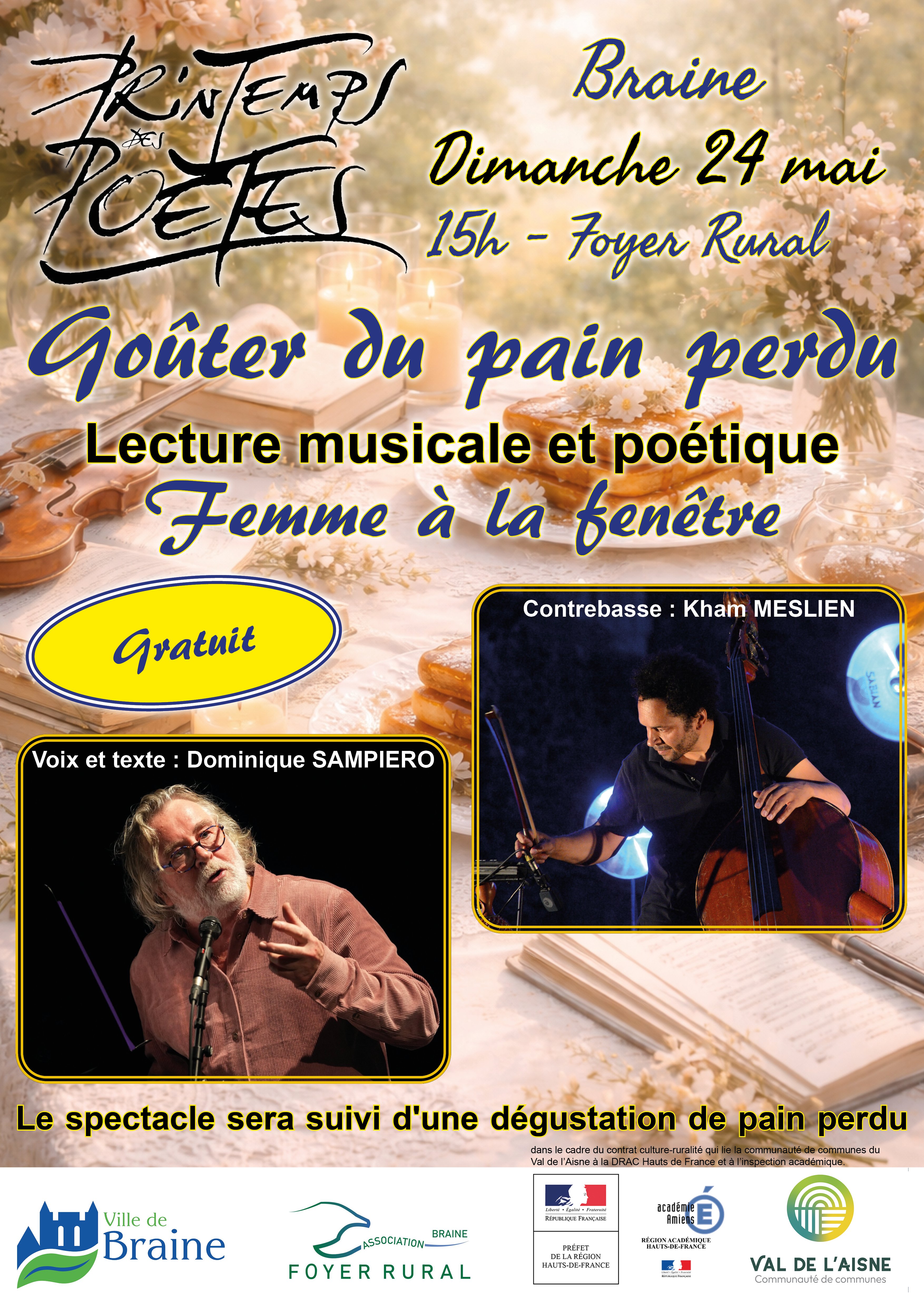 Printemps des poètes - - - - - - - Dans le cadre du Printemps des Poètes Dominique Sampiero est dans le Val de l'Aisne. ***** Femme à la fenêtre Lecture musicale Voix et texte Dominique Sampiero Contrebasse Kham Meslien Gratuit Le spectacle sera suivi d'une dégustation de pain perdu.