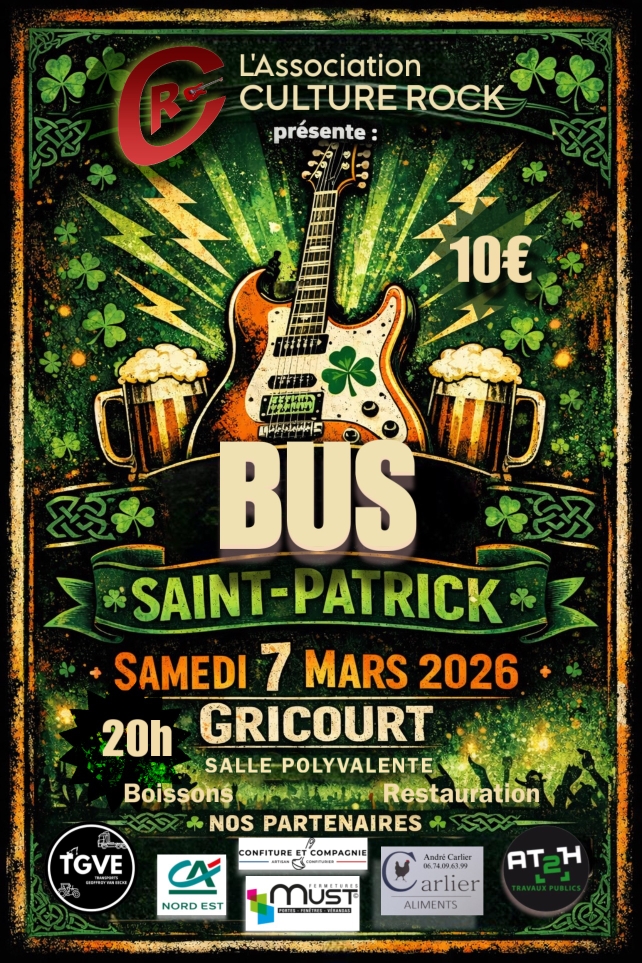 Venez célébrer la Saint-Patrick à Gricourt avec un concert rock Irlandais et anglo-saxon. Rendez-vous à 20h à la salle des fêtes de Gricourt. Tarif : 10€