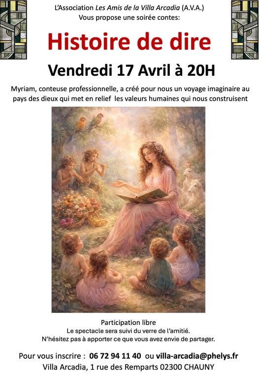 Rendez-vous le 17 Avril à 20h pour " L'Histoire dire" avec Myriam conteuse professionnelle, a crée pour nous un voyage imaginaire au pays des dieux qui met en relief les valeurs humaines qui nous construisent. Participation libre Le spectacles sera suivi d'un verre de l'amitié.