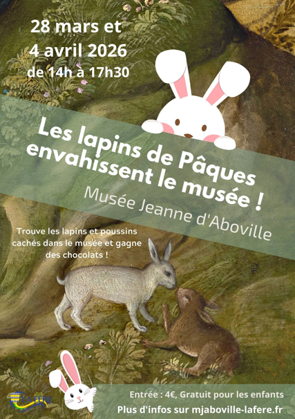 Du 28 mars au 4 avril, Les lapins de Pâques envahissent le musée Jeanne d'Aboville ! Rendez-vous de 14h00 à 17h tous les jours sauf le mardi et le dimanche Ce rendez-vous devenu classique convie les enfants à venir découvrir le musée sous un angle ludique en cherchant les lapins et les poussins de pâques dissimulés dans les salles. Nécessitant juste un peu d’observation, cette visite peut se faire en famille pour aborder la peinture d’un point de vue ludique. Tarifs : 4€, gratuit pour les enfants, sans réservation. Durée: environ 1h. Plus d’infos sur mjaboville-lafere.fr 5 Rue du Général de Gaulle, 02800 La Fère