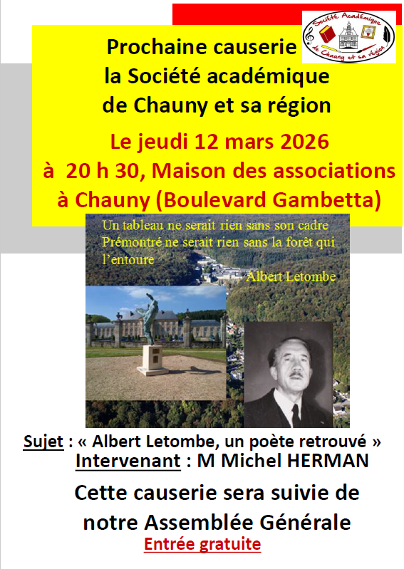 Rendez-vous le jeudi 12 mars 2026 à 20h30 pour la nouvelle causerie de la société académique à la maison des associations à Chauny. (boulevard gambetta) Au programme : Monsieur Michel Herman au sujet d'Albert Letombe, un poète retrouvé. Tarifs : Gratuit. Infos : 03 23 39 87 49