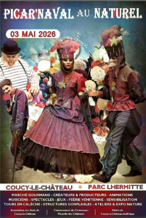 Rendez-vous le dimanche 3 mai 2026 de 10h à 19h pour le Picar'naval au Naturel Au Parc lhermitte de Coucy-le-Château . Au programme : Marché Gourmand, présence de créateurs et producteurs, animations, musiciens, spectacles, jeux ... Restauration et buvette sur place. Tarifs : Gratuit, entrée libre. Informations au 03 23 52 70 05