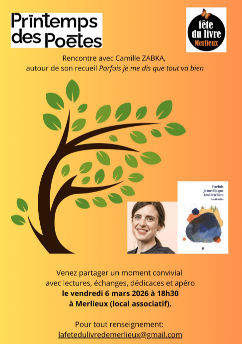 Printemps des poètes: Rencontre avec Camille Zabka pour son recueil Parfois je me dis que tout va bien. Au programme: Un moment convivial, échanges et apéritif le vendredi 6 mars à 18h30 à Merlieux. Pour tout renseignement: lafetedulivredemerlieux@gmail.com