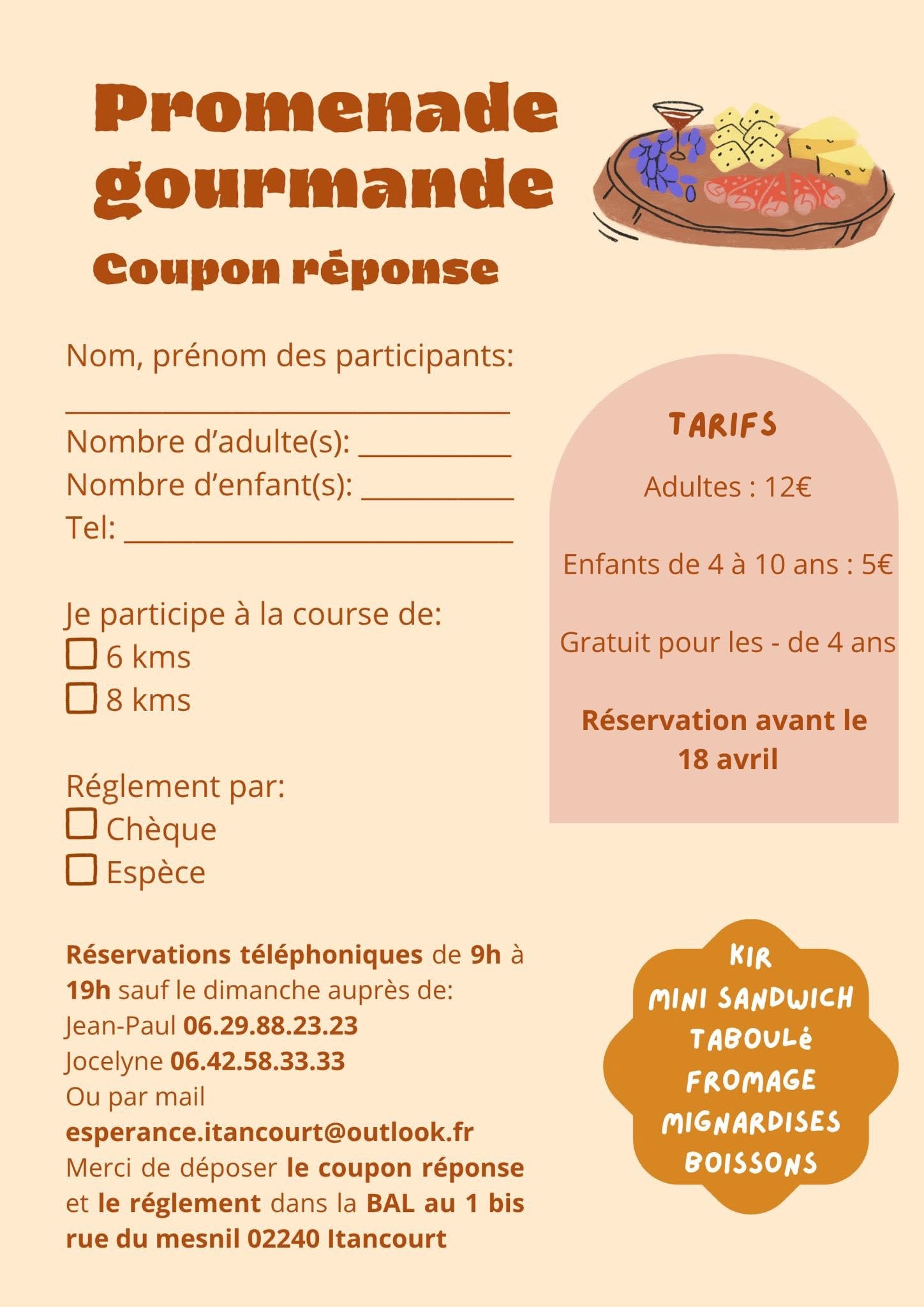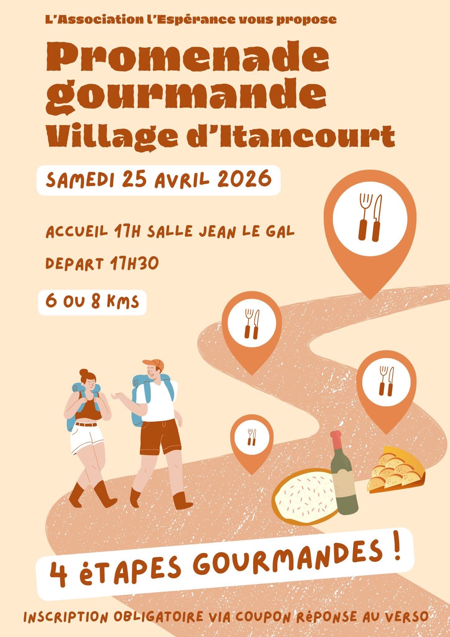 L'association L'espérance à Itancourt organise une promenade gourmande de 6 ou 8 km, le samedi 25 avril 226 à 17 heures (rendez-vous salle Le Gal). Départ à 17h30. Tarifs : - adultes : 12€ - enfants de 4 à 10 ans : 5€ - gratuit pour les moins de 4 ans. RESERVATION AVANT LE 18 AVRIL. Voir modalités sur le coupon en photo. Renseignements : 06 29 88 23 23 ou 06 42 58 33 33 esperance.itancourt@outlook.fr