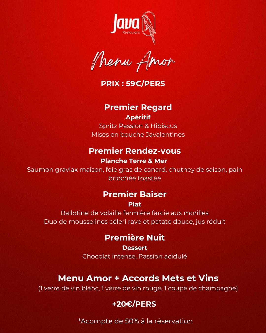 "À tous les tourtereaux de Saint-Quentin et des alentours, le pigeon voyageur de La Java vient de déposer son menu pour la Saint-Valentin. Venez profiter d’un dîner romantique au bord de l’étang d’Isle. Une soirée pleine de saveurs et d’amour ! Tarif : 59€ Réservez votre table dès maintenant par téléphone au 03 23 05 30 30 ou en quelques clics sur notre site : lajavarestaurant.fr *Acompte de 50% requis pour valider la réservation." - Restaurant La Java, avenue Léo Lagrange, 02100 Saint-Quentin.