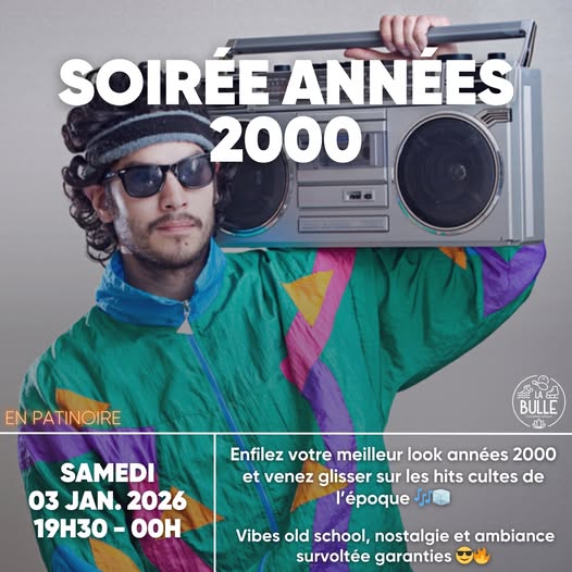 Envie de patiner sur les hits de Usher, Beyoncé, Sean Paul ou Britney ? Venez à la patinoire pour une session spéciale années 2000 samedi 3 janvier 2026, de 19h30 à minuit. Sortez vos jeans taille basse, bandanas et votre meilleur look old school Une playlist 100% 2000’s pour une ambiance nostalgique et survoltée Fun et bonne humeur garanties ! Tarif patineur : 10 € locations de patins incluses (à vérifier) Accompagnateur : 2 € (sans accès à la glace)
