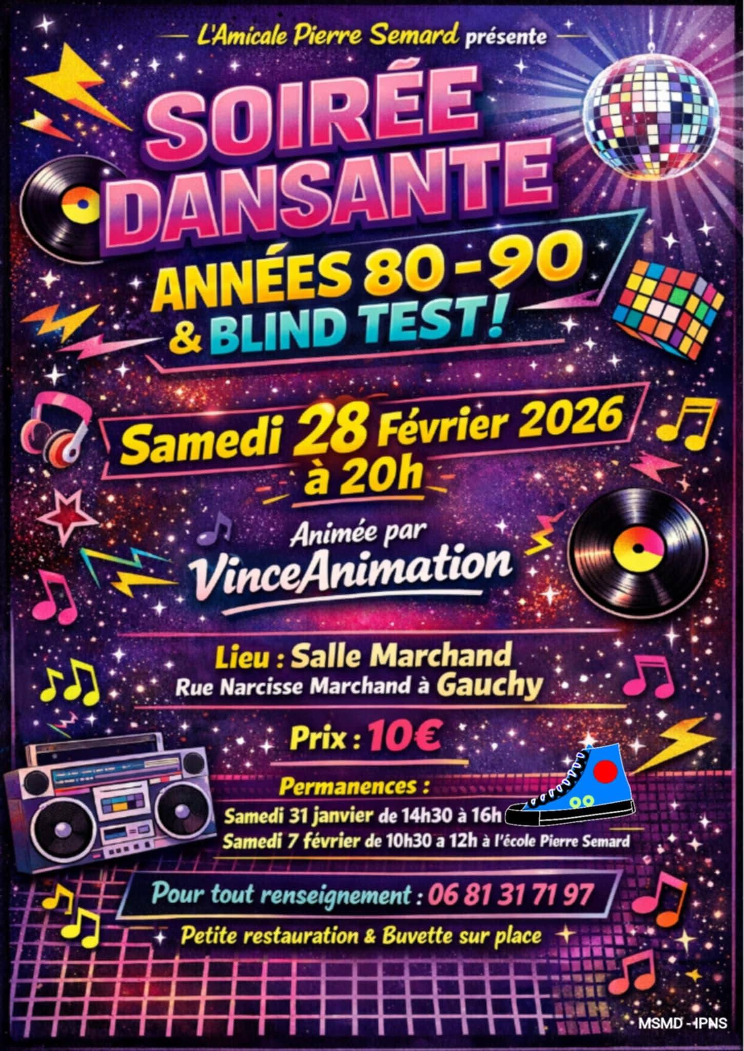 L'amicale Pierre Semard vous propose une soirée dansante et blind test années 80-90 ! Rendez-vous le 28 février à 20h à la salle Marchand de Gauchy. Animée par VinceAnimation ! Prix 10€ Permanences : Samedi 31 janvier de 14h30 à 16h. Samedi 7 février de 10h30 à 12h à l'école Pierre Semard. Pour tout renseignement : 06 81 31 71 97. Petite restauration et buvette sur place.