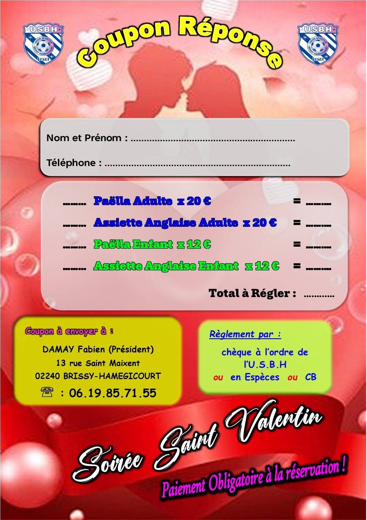 L'association sportive Brissy-Hamégicourt organise une soirée dansante pour la Saint-Valentin le samedi 14 février 2026 à partir de 19 heures, à Moÿ-de-l'Aisne, animée par Rodolphe B. Tarif adulte : 20€. Tarif enfant (moins de 12 ans) : 12€ Menu : Apéritif, paëlla ou assiette anglaise, fromage et salade, dessert et café. Réservations au 0619857155 (paiement à la réservation).