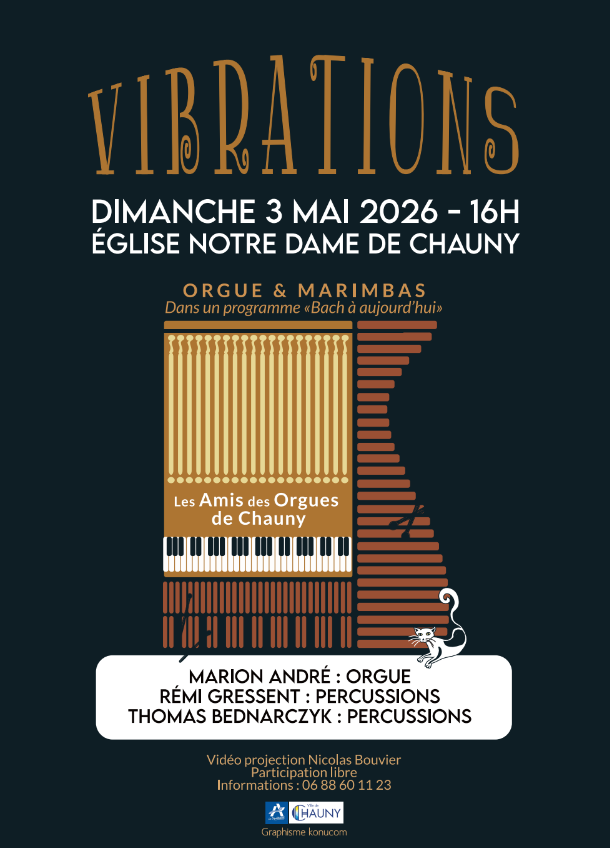 Rendez-vous le dimanche 3 Mai à 16h pour l'événement " Vibrations" à l'Eglise de Notre Dame de Chauny. Dans un programme "Bach à aujourd'hui". Marion André : Orgue. Rémi Gressent : Percussions. Thomas Bednarczyk : Percussions. Participation libre.