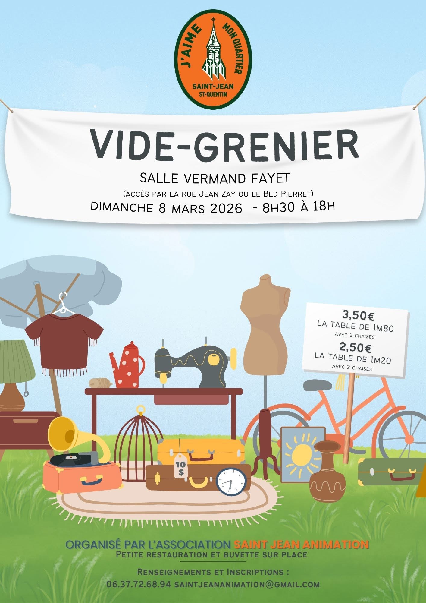 L'association Saint-Jean animation vous propose un vide-grenier le dimanche 8 mars. Rendez-vous à la salle Vermand Fayet (accès par la rue Jean Zay ou le boulevard Pierret) entre 8h30 et 18h. 3,50€ la table de 1m80 2,50€ la table de 1m20 Petite restauration et buvette sur place. Renseignements et inscriptions : 06 37 72 68 94 / saintjeananimation@gmail.com