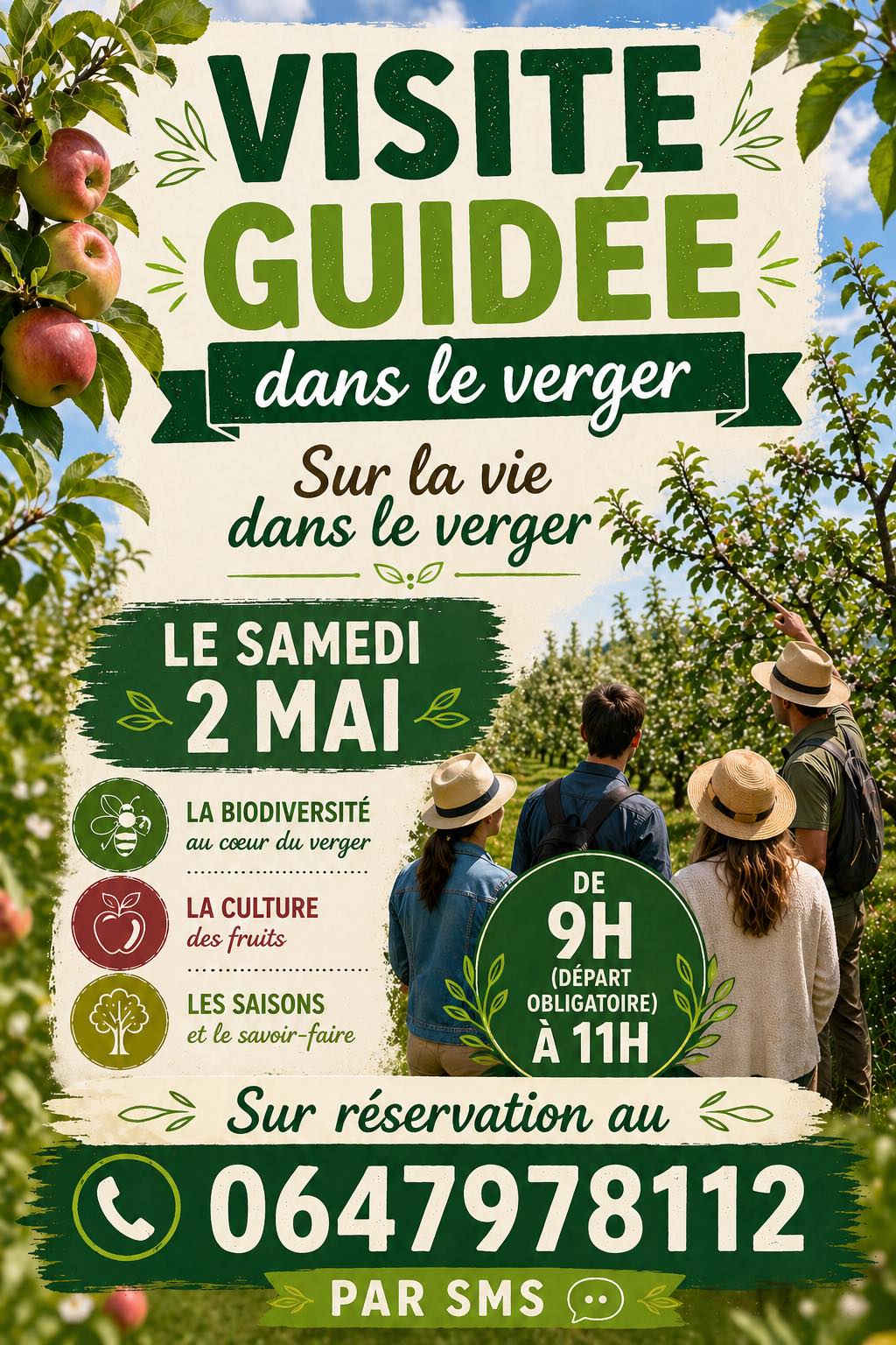 Entrez dans les coulisses du Verger Martine et découvrez les secrets de la vie dans le verger lors d’une visite guidée originale, le samedi 2 mai 2026 de 9h à 11h. Départ à 9h précises pour une immersion nature au cœur des arbres fruitiers. Réservation obligatoire par SMS au 06.47.97.81.12.