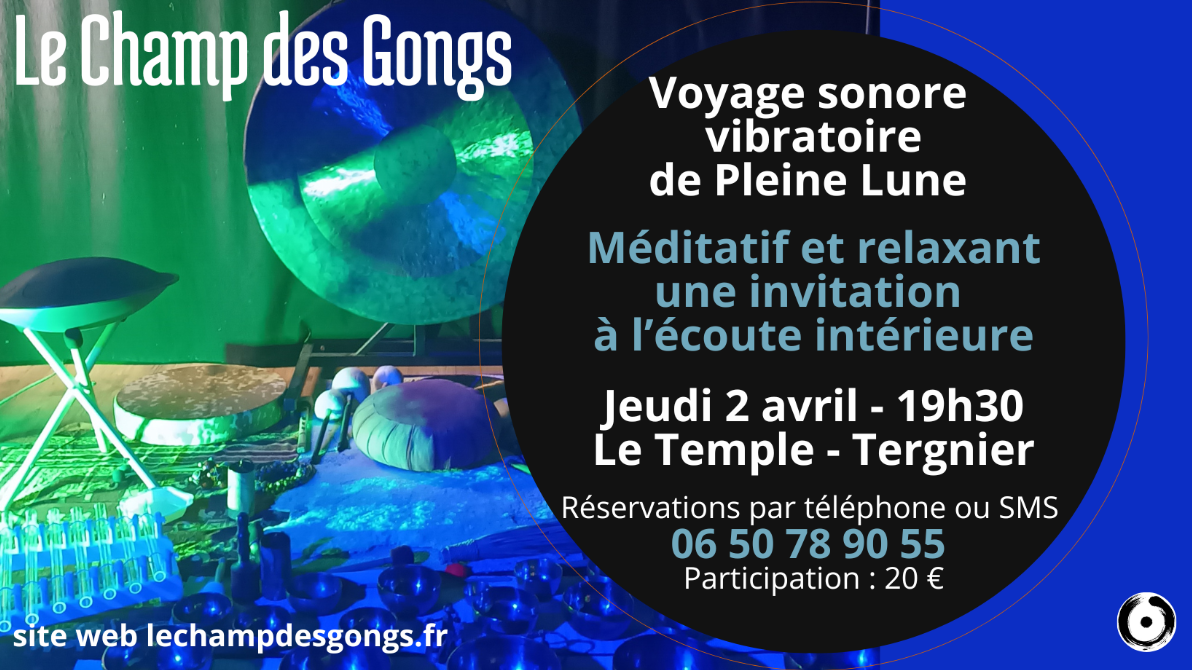 Rendez-vous au Temple de Tergnier le jeudi 2 avril à 19h30 pour un voyage sonore vibratoire de Pleine Lune. Tarif : 20€ sur réservation. Plus d'informations et inscription au 06 50 78 90 55 ou par mail : lechampdesgongs@gmail.com