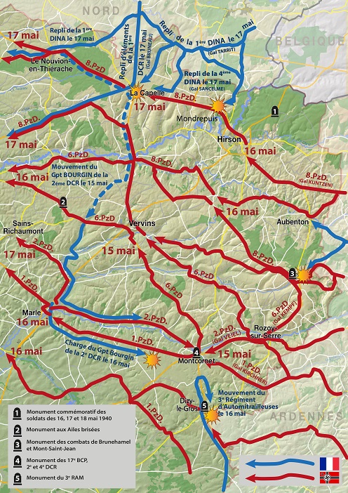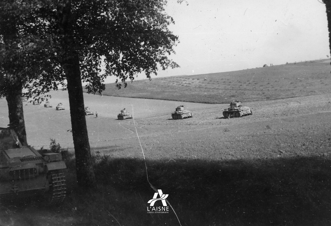 Très rapidement la Thiérache devient le goulot d’étranglement d’une grande partie du corps de bataille allemand, les 1ère, 2e, 6e puis 10e Panzerdivisionen (PzD) descendant les vallées de la Serre et de l’Oise, par Vervins et Guise. Leur objectif : foncer résolument vers l’Ouest, au-delà de l’Oise et de la Somme, pour gagner au plus tôt le littoral de la Manche et couper les armées alliées en deux. Tandis que le Grand Etat-Major de l’armée française tente de rassembler des forces pour leur interdire toute progression, ce qu’il reste des divisions de la 9e armée française se replie de Belgique. Ces troupes exténuées ne peuvent tenir très longtemps face à la puissance mécanique de leur adversaire.