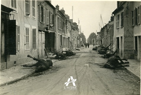 Cadavres de chevaux dans une rue bordée de maisons à Hirson ©Arch. dép. Aisne 2 Fi 1115