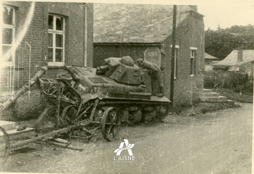 Char français R-35 du 32e bataillon de chars de combat détruit dans une rue de Mondrepuis ©Arch. dép. Aisne 2 Fi 1086