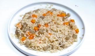 Faites revenir le riz et l’oignon émincé dans l’huile d’olive