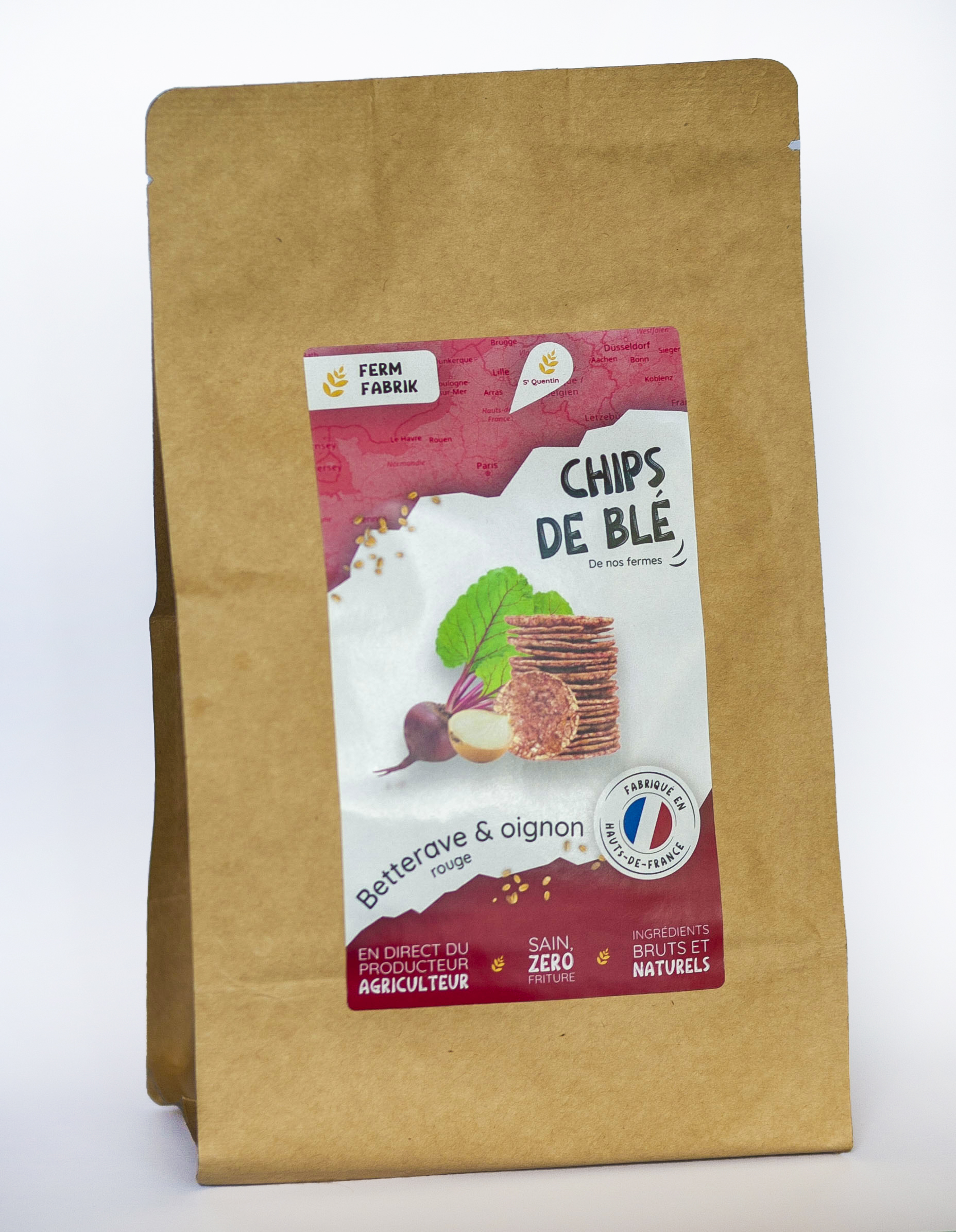 "A l’origine de ce projet, il y a l’envie de recréer du "positif" dans l’agriculture. J’ai travaillé par le passé dans l’industrie agro-alimentaire et j’ai eu le sentiment qu’il fallait "reconnecter" le consommateur avec les producteurs et revenir au "local"." Et tant qu’à réinvestir le local, autant le faire avec un produit original, nouveau et vertueux. "Le grain de blé cuit réagit un peu comme du pop-corn, il est donc "formé" pour donner une chips sans passer par la case "friture", juste un peu d’huile de tournesol appliquée à froid, ce qui fait que nos chips sont à 70 % moins grasses que les chips traditionnelles." Elles se déclinent "nature", finement salées au Sel des deux cap, une fleur de sel séchée au bois de hêtre produite dans les Hauts-de-France, mais aussi aromatisées naturellement : betterave rouge et oignon, piment doux et enfin tomate. Un produit sain, à base d’ingrédients naturels en direct du producteur : une autre façon de concevoir l’apéro !