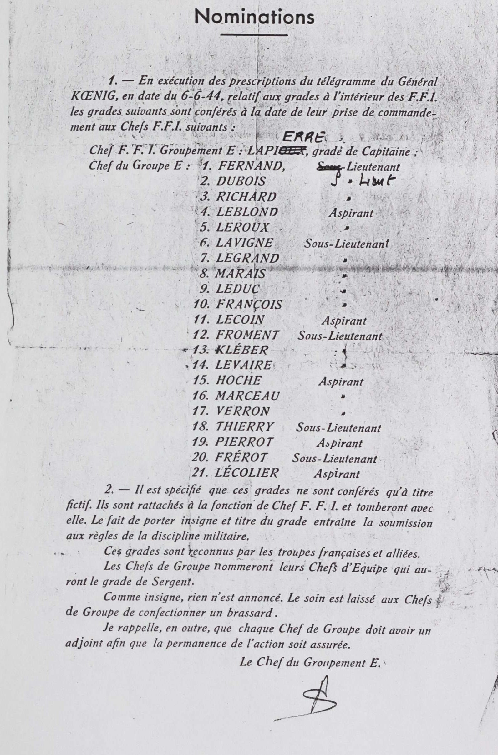 Nomination des chefs de secteur du Groupement E en 1944 ©SHD GR 19P2