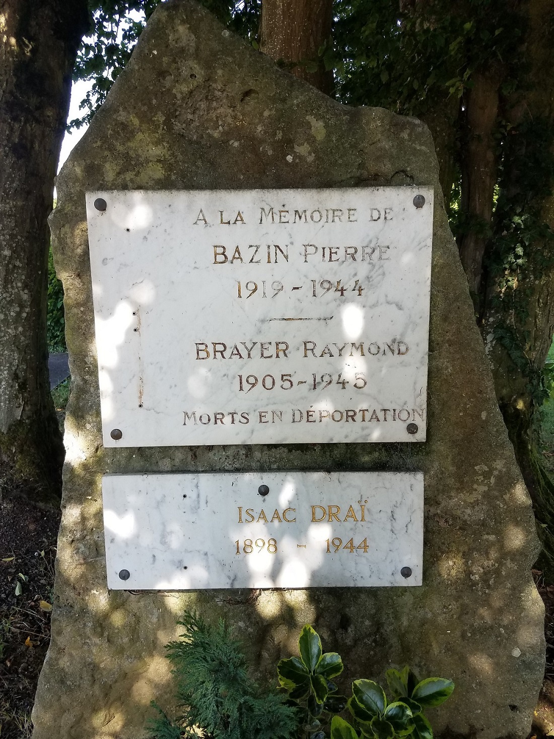 L’occupation verra aussi la commune touchée par la répression et la barbarie nazie, et une stèle à la mémoire de trois hommes honore leur mémoire dans le jardin de la mairie de Nogent-l’Artaud : Pierre BAZIN, Raymond BRAYER et Isaac DRAÏ. Le premier, Pierre Bazin (1919-1944), né le 3 mai 1919, est un jeune marin de la base de Toulon en 1940 quand il rejoint la Résistance et fournit des renseignements aux Alliés. Ses informations permettront en 1942 la destruction de la centrale électrique de l’arsenal de Toulon par les Anglais mais dénoncé et arrêté, il est détenu à la prison de Fresnes puis déporté le 22 novembre 1943 vers Buchenwald puis Natzwiller-Struthof. Evacué vers Bergen-Belsen, il y trouvera la mort le 23 avril 1944. Le second résistant Nogentais honoré par cette stèle est Raymond Brayer (1905-1945), né à Nogent-l’Artaud le 31 décembre 1905. Réfugié à Aubigny-sur-Nère, celui-ci aidera la Résistance par des transports clandestins mais sera dénoncé, arrêté et emprisonné au camp de Royallieu d’où il sera déporté le 28 juillet 1944 pour le camp de Neuengamme. Il y meurt en déportation le 2 février 1945 et son corps repose depuis 1955 au cimetière de Nogent-l’Artaud. La commune ne sera pas non plus exempte de victimes de la Shoah, puisque le troisième nom porté est celui de Isaac Draï (1898-1944), boucher casher polonais installé dans le XVe arr. de Paris, et qui était venu se réfugier à Nogent-l’Artaud durant l’occupation. Dénoncé puis arrêté, il sera interné à Drancy du 19 janvier au 2 février 1944 avant d’être déporté pour Auschwitz.