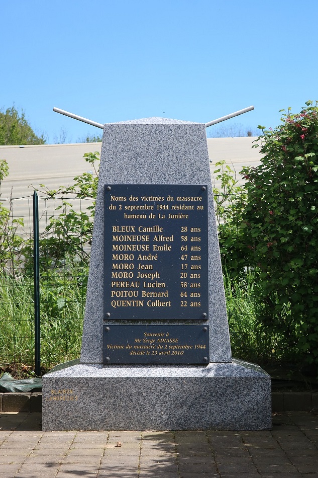 Plus loin, au hameau de la Junière, le groupe de soldats allemands ayant emprunté le chemin de l’écluse n° 2 a traversé les pâtures et atteint les premières fermes. Serge Addiasse, qui était alors un jeune homme, se souvient : « Les nazis nous qualifièrent de "Vous terroristes, vous tous kapouts". Dans un premier temps, après forte distribution de coups de crosse dans le dos et de coups de bottes, nous fûmes alignés dans la cour de la ferme de Monsieur Lucien Pereau, pour être fusillés devant les femmes et les plus jeunes enfants. Mon père, ancien prisonnier civil de 1914-1918 et Colbert Quentin, instituteur à La Neuville-lès-Dorengt, qui parlaient assez bien la langue allemande, essayèrent de parlementer avec le commandant, mais celui-ci répétait toujours "Vous terroristes, Vous kapouts", d’autant plus que les soldats allemands avaient vu les deux camions qui avaient été pris la veille, et qui étaient camouflés dans une grange. ». S’en prenant à tous les civils qui passent au hameau de la Junière, les soldats allemands interpellent André Moro accompagné de ses deux fils Joseph (20 ans) et Jean (16 ans) puis les laissent repartir avant de les mitrailler dans le dos. Vers 10h, de nombreux coups de feu et des rafales sont entendus du côté du carrefour des Quatre Chemins, non loin du hameau de la Junière. Alertés par les incendies, six résistants sont en effet venus en reconnaissance et ont engagé le combat avec les soldats allemands qui se hâtent de pousser sur la route les civils pris en otages à la Junière afin d’en faire des boucliers humains. Cela convainc les résistants de rebrousser chemin, mais ne dissuade pas les soldats allemands de poursuivre leur action : conduits dans la cour de la ferme d’André Boulanger, les otages de la Junière sont alignés contre un mur.