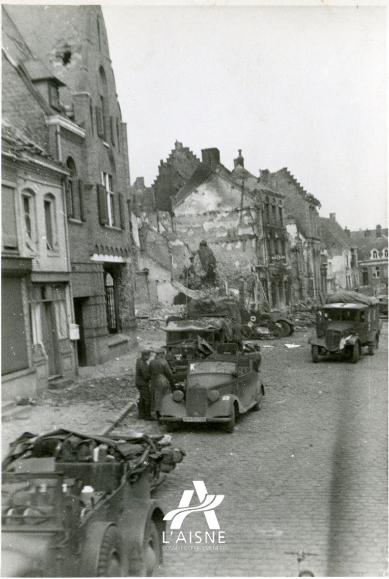 Colonne de véhicules de la 6. PzD dans Guise. © Arch. dép. Aisne, 2 Fi 349