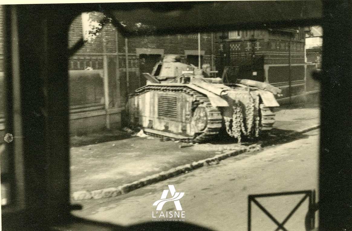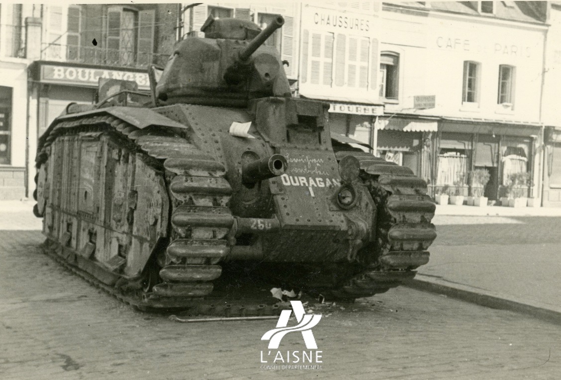 Dans une rue de Guise, char B1 bis « Ouragan » du 8e bataillon de chars de combats (BCC), abandonné après les combats ©Arch. dép. de l’Aisne, 2 Fi 336