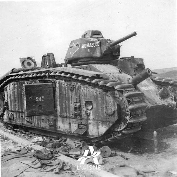 Char B1 bis « Bourrasque » du 15e bataillon de chars de combats (BCC), immobilisé dans les environs de Mortiers le 17 mai 1940. © Arch. dép. de l’Aisne, 2 Fi 2.