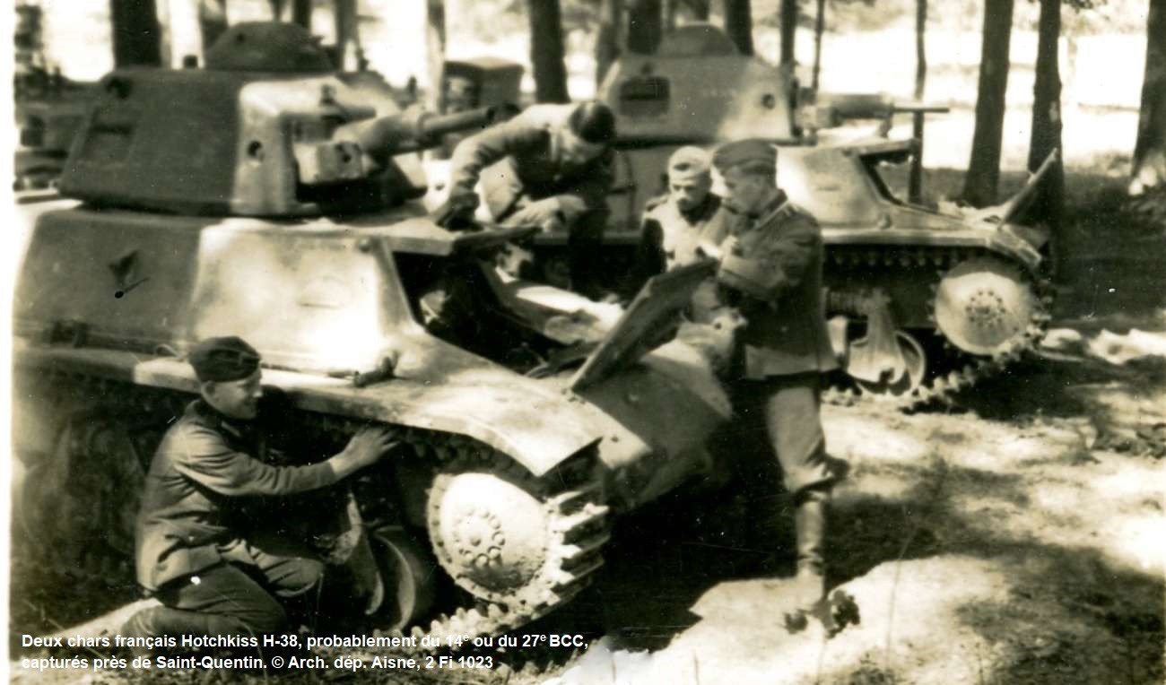 Deux chars français Hotchkiss H-38, probablement du 14e ou du 27e BCC, capturés près de Saint-Quentin ©Arch. dép. Aisne, 2 Fi 1023