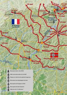 Dès le début de l’après-midi, les Français sont débordés par les blindés allemands qui ont concentré leurs efforts sur la vallée de l’Oise, et les portes du Vermandois sont désormais ouvertes. Dans la soirée, l’ordre de repli est donné aux chars qui défendent la vallée de l’Oise mais tous ne le recevront pas. Les 18 et 19 mai, ce qu’il reste des 8e, 14e et 15e BCC, isolés dans le Nord du département, devront faire face à la 8e PzD devant les ponts sur le canal de la Sambre à l’Oise.