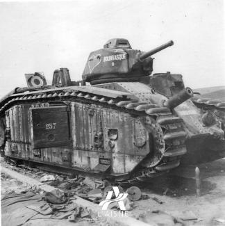 Char B1 bis « Pirate » du 8e bataillon de chars de combats (BCC), détruit dans les environs de Mortiers le 17 mai 1940. © Arch. dép. de l’Aisne, 2 Fi 350