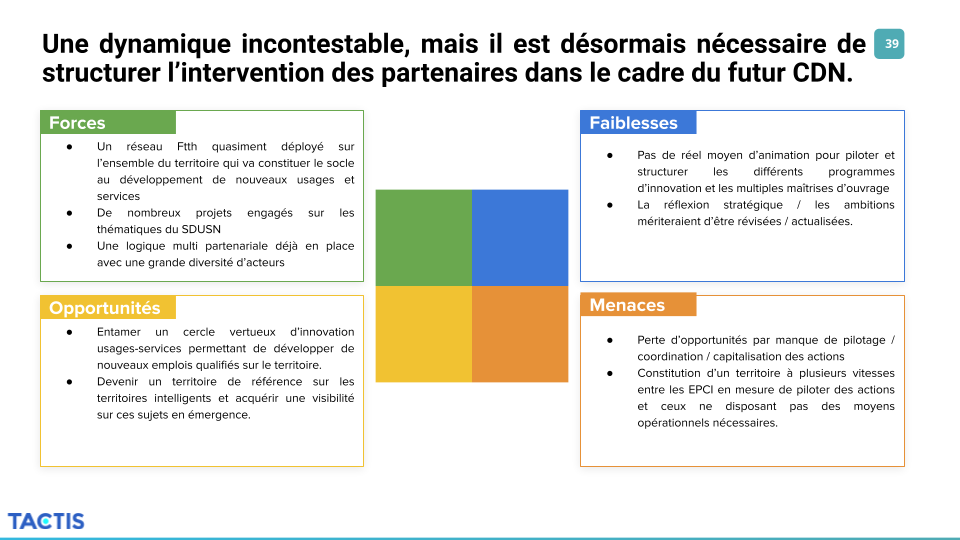 En synthèse, pour bâtir la nouvelle feuille de route, les forces, faiblesses, opportunités et menaces ont pu être établies ainsi :